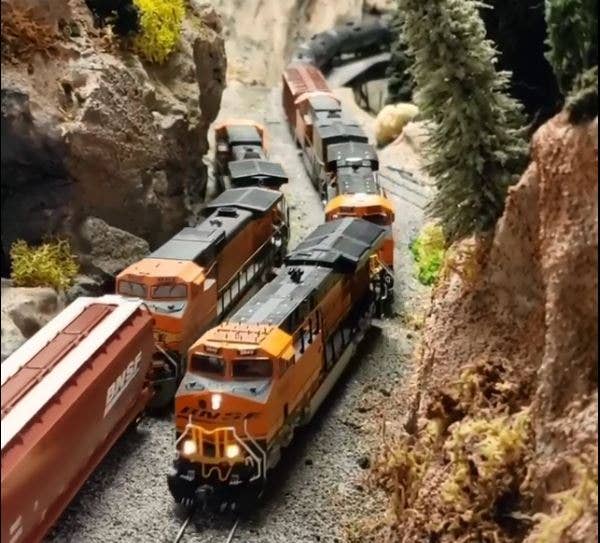 Towering cliffs and narrow passes make western mountain railroading a popular setting for model train layouts. A perfect example is this video by Custom-Trains showing a meet between two BNSF Ry. freights on his HO scale railroad.