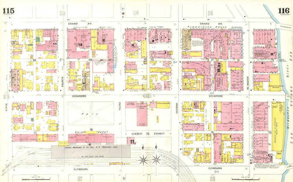 One of the busiest spots in the city, the area in and around Milwaukee’s venerable Everett Street Station hummed with arrivals and departures day and night from 1886 to 1964. The actual complex stretched over three blocks, anchored by the massive 600' long train shed. Trains entered and departed from the east and west through broad curves at either end, passing by a powerhouse, Railway Terminal Post Office, Railway Express Agency facilities, and a small turntable.